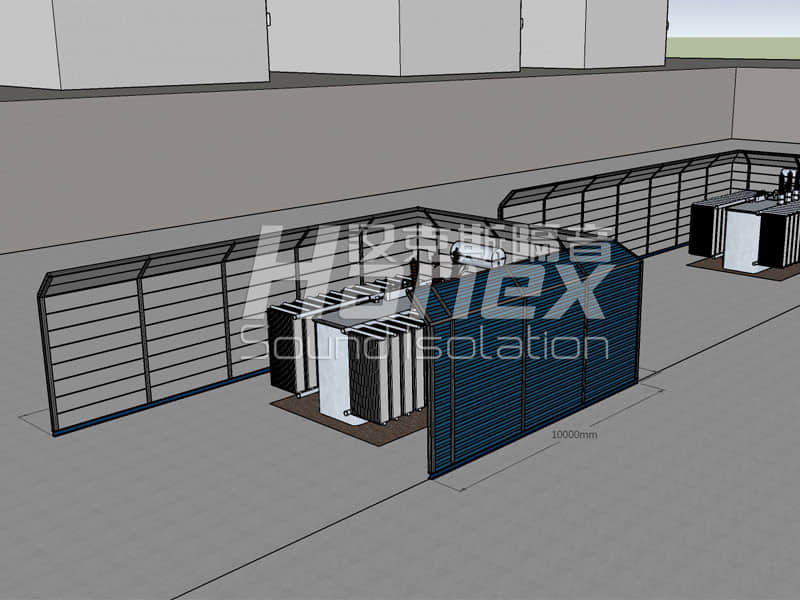 根據(jù)現(xiàn)場(chǎng)噪聲源值大小、頻譜、噪聲源與附近居民樓位置關(guān)系、設(shè)備通風(fēng)散熱要求等因素,結(jié)合我們漢克斯隔音以往同類型項(xiàng)目分析,設(shè)計(jì)對(duì)該變電站采用2道U型屏障的方式進(jìn)行降噪處理。